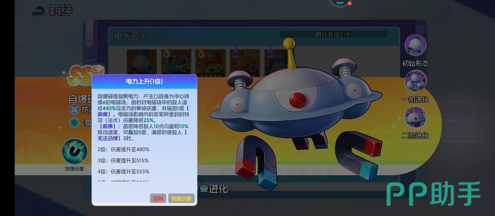 核心技能“电力上升”可激活持续约6秒的电磁力场。力场范围内,每秒对敌方单位造成等同于自身攻击力440%的伤害,并附加麻痹状态。该技能的战略意义远超单体输出:麻痹效果具备明确的叠加机制——每层降低目标10点闪避值与10%移动速度,最高可叠至5层;叠满后触发强制控制效果,使目标陷入无法行动的状态。这意味着自爆磁怪一旦入场,便能系统性削弱敌方机动性与规避能力,为团队创造稳定输出窗口与集火节奏。