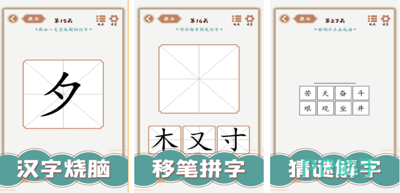 汉字多变化是专注于儿童学习汉字知识的益智作品,简单玩法配以娱乐的性质令孩子着迷,猜字谜、书写汉字等特殊内容可玩性更高,极为烧脑的汉字解谜模式吸引了玩家好奇心,移动笔画完成拼字的玩法也便于孩子记住汉字,一系列跟汉字相关的趣味性能容对孩子的智力很有帮助,由此可见汉字多变化这款汉字游戏的可玩性。