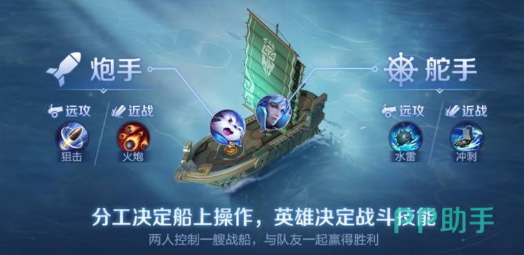 每艘战船由两名玩家共同操作:一人担任舵手,负责航行路线与规避敌方火力;另一人则作为炮手,掌控主炮攻击节奏。根据所选英雄的不同,船只还将解锁专属技能,进一步丰富战术组合。不同于常规对线模式,该玩法无兵线干扰,所有对抗均围绕海上舰艇展开,整体节奏更为迅捷紧凑。
