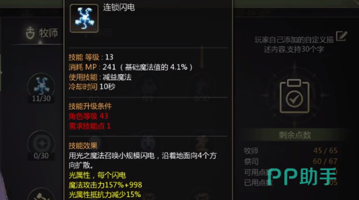 在辅助加点方面建议选择连锁闪电11级,还有思域以及瞬打,三级闪电风暴或者是三级神圣风暴,就可以作为主要的输出技能。光明之呼吸、无形打击这些辅助技能也应该点满,能够有效提升伤害值。