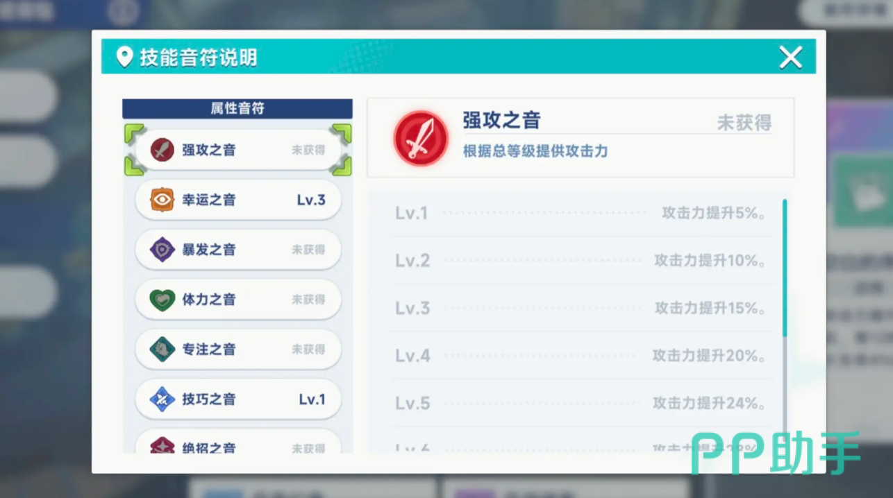 音符系统的核心功能在于为角色提供基础属性加成。不同类别的音符对应不同的增益效果。例如,强攻音符可使基础攻击倍率提升5%,而体力值音符则能增加20%至50%的基础生命值,直接强化生存或输出能力。