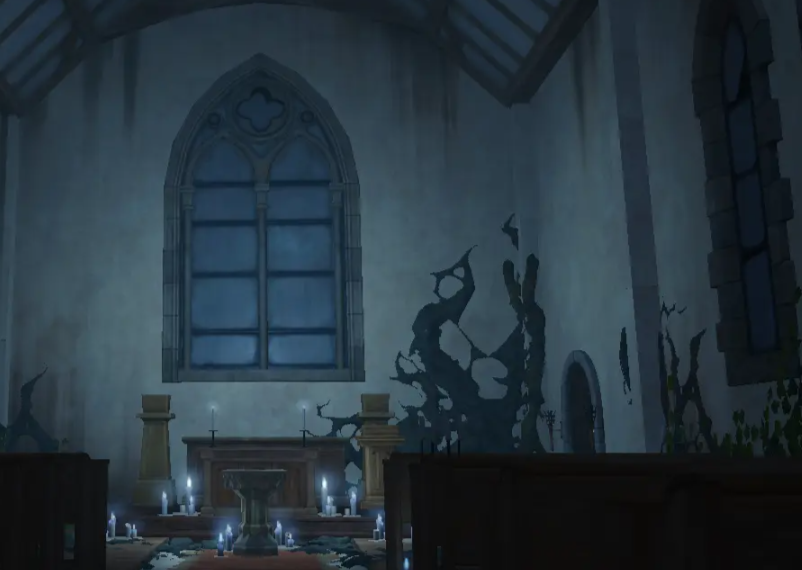 重做后的温莎镇整体色调大幅变暗,光线几乎被完全削弱,取而代之的是阴冷、压抑的环境氛围。街道与建筑遍布侵蚀痕迹,墙体上的裂痕与扭曲植被交织,营造出强烈的不安感,让玩家刚踏入区域便能感受到浓厚的恐怖气息。