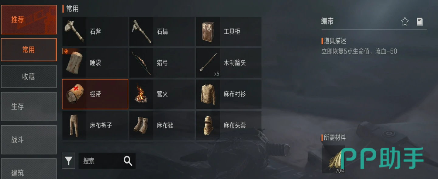 绷带并非可以直接拾取的现成物品,而是需要通过制作系统合成。玩家首先需在地图中采集基础材料——纤维。这种资源广泛分布于草丛、破损衣物或植物残骸中,采集难度较低,几乎随处可见。收集到足够数量的纤维后,前往任意制作台即可进行合成操作,整个流程简单快捷,适合新手快速上手。