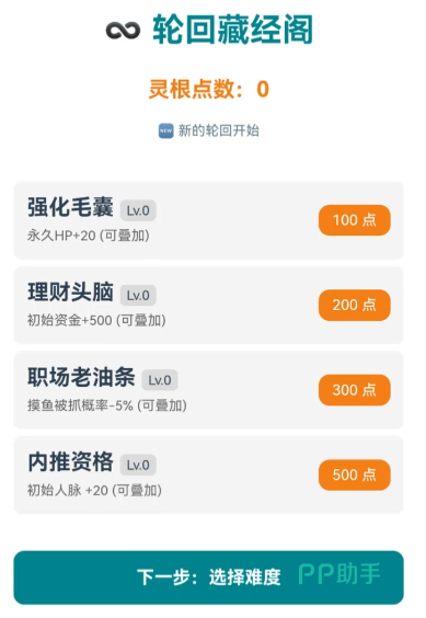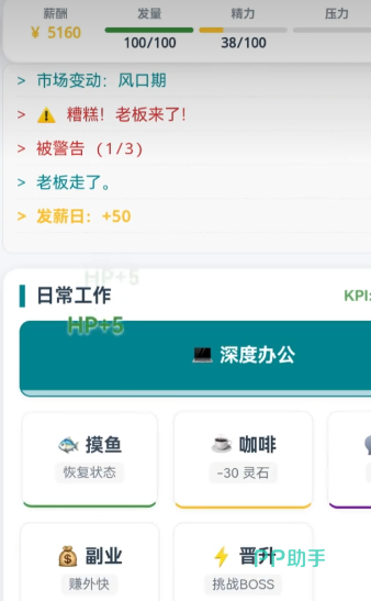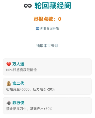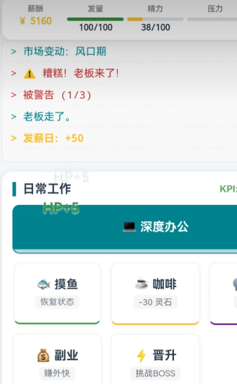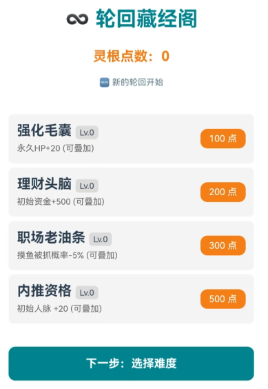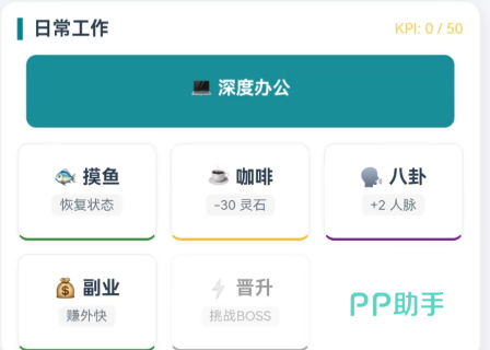 界面设计延续极简主义风格,主操作区以清晰选项按钮呈现。所有职场行动(如加班赶工、参与复盘会议、申请调岗)均可提升境界等级;而炼丹、布阵、购置法宝等修真行为则需消耗游戏内货币“灵石”。这种将现实职场逻辑与修真成长模型深度耦合的设计逻辑,构成了本作的核心玩法张力。