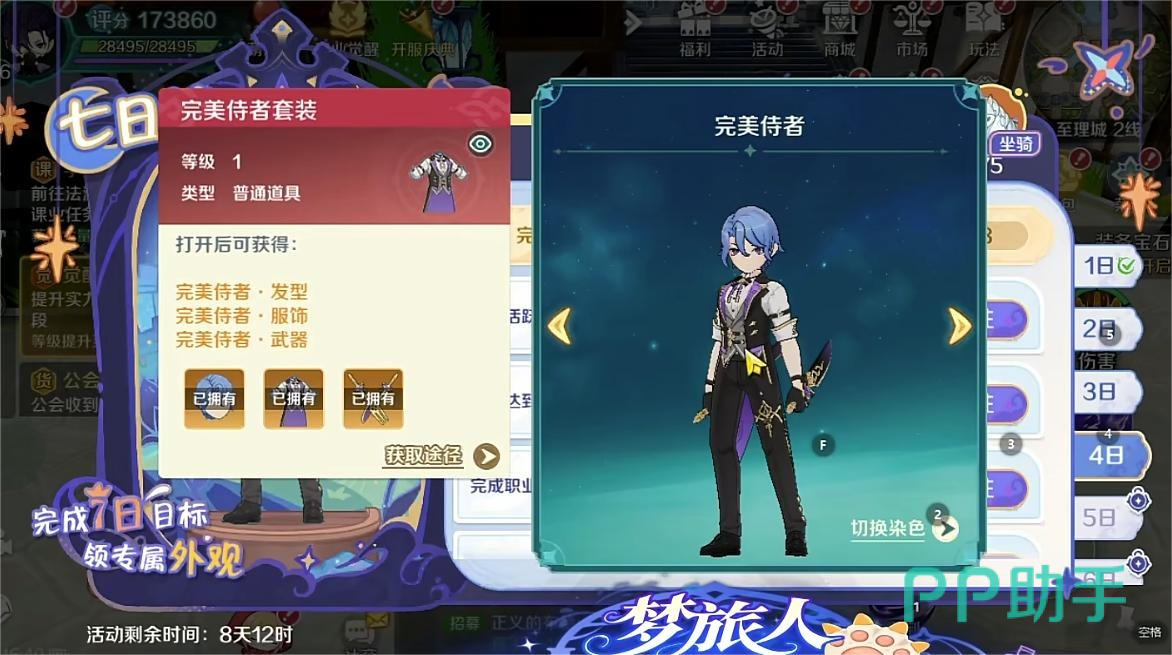 新手入门的第一步,推荐从连续签到开始。首周签到奖励丰富,涵盖过渡期关键装备、稀有养成材料及限定外观——“完美侍从”时装。该时装分男女款设计,视觉风格差异明显,属限时获取内容,需完整坚持七日方可集齐全套。