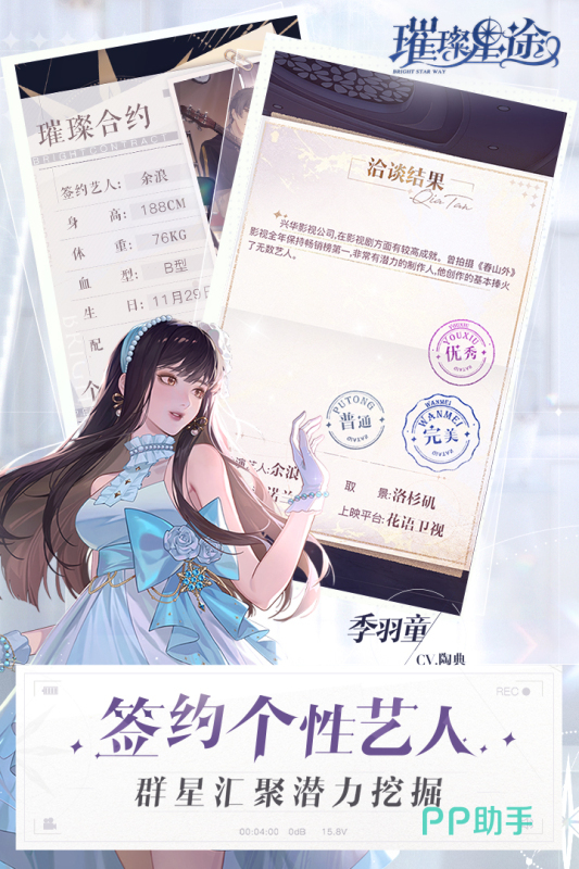 《璀璨星途》你将以一名新星的身份,在激流勇进的演艺圈开启闯荡,游戏设定了多个面如冠玉的男主角,玩家可根据他们的爱好和性格进行攻略,来展开一段如蜜似糖的恋爱体验,同时你需要在游戏里恪尽职守的去完成任务,让你的知名度遵循循序渐进的提升,去获得更多通告演绎的机会,最终在更大的舞台一炮走红。