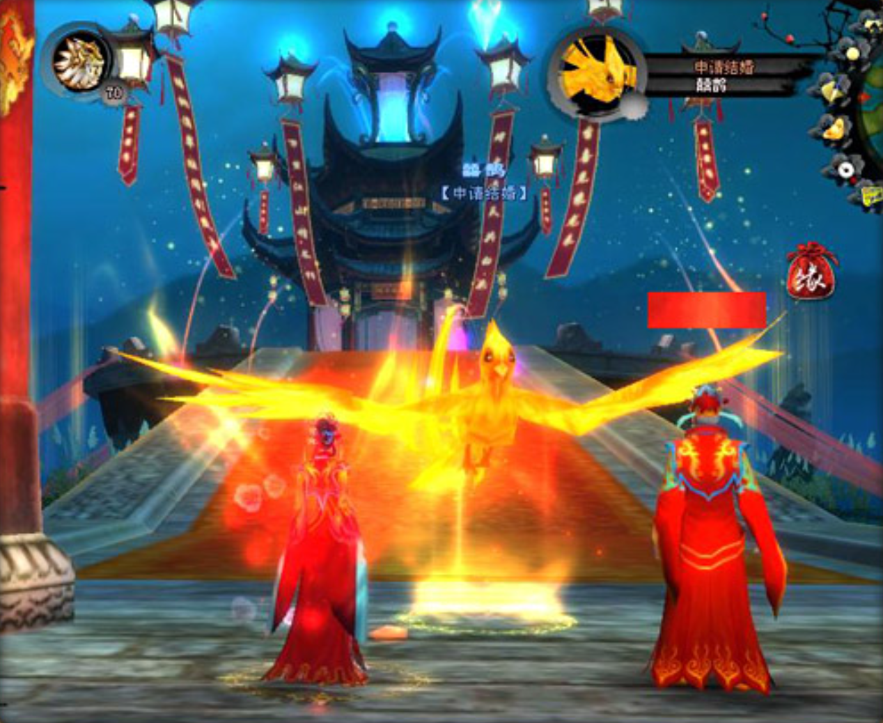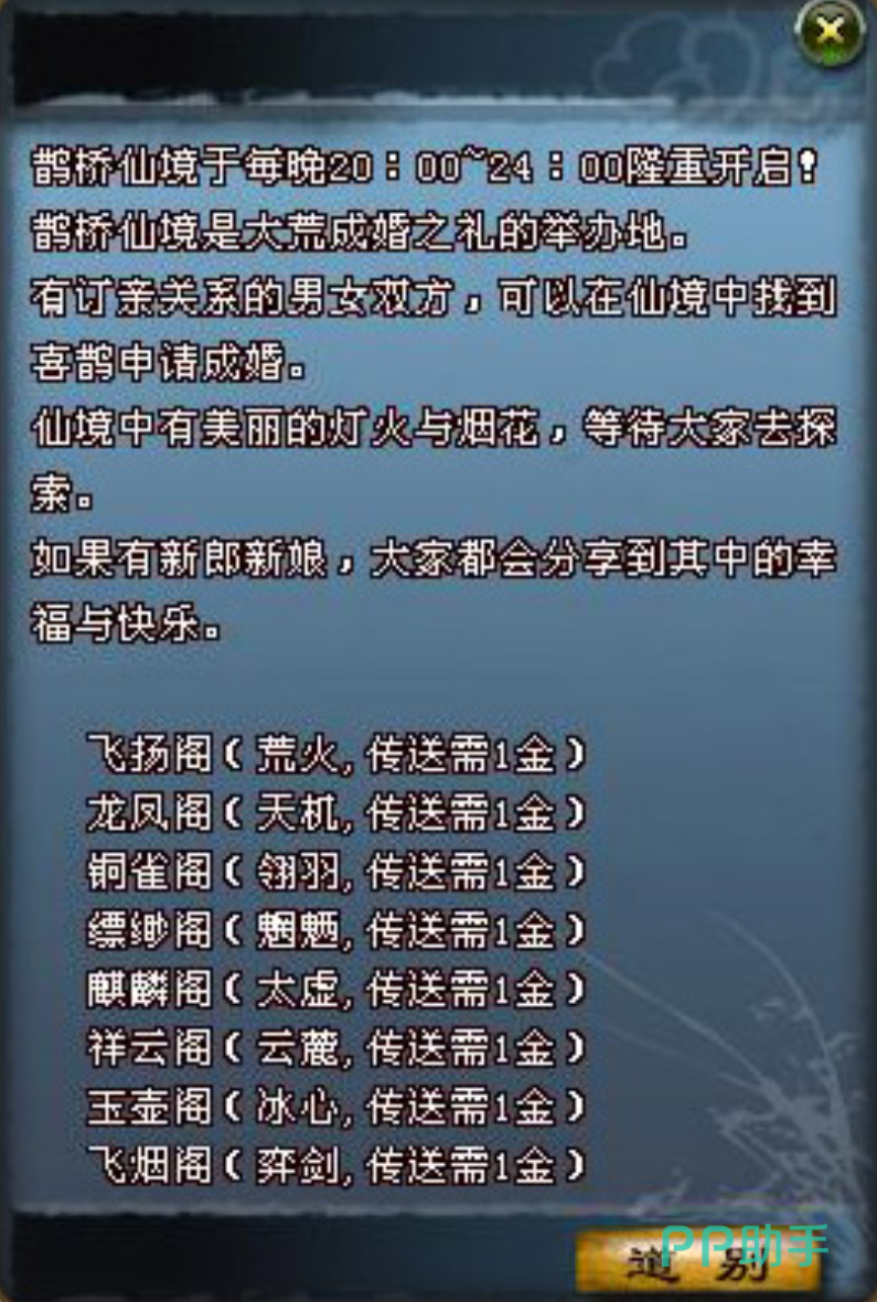 正式婚礼仅可在限定时段内举办:工作日(周一至周五)20:00–24:00,或周末(周六、周日)09:00–23:40。玩家需抵达指定婚礼场地,缴纳对应数额的游戏货币作为礼金。支持多场景选择,如鹊桥仙境等主题婚宴地图;进入后需消耗金币激活场景,并寻访NPC“天荒地老”,启动拜堂流程。仪式严格遵循“三拜之礼”环节,全部完成后即宣告婚姻成立,双方获得“大荒夫妇”称号及电子版结婚证,同时领取专属新婚礼包。