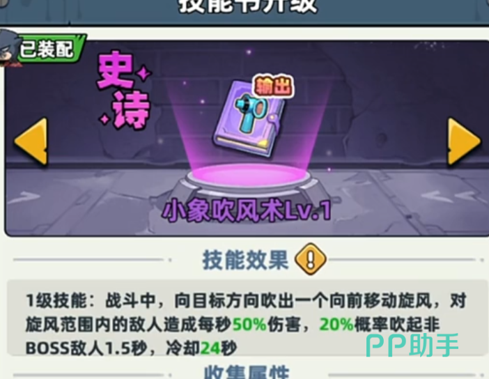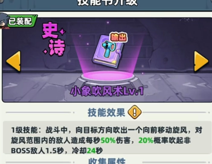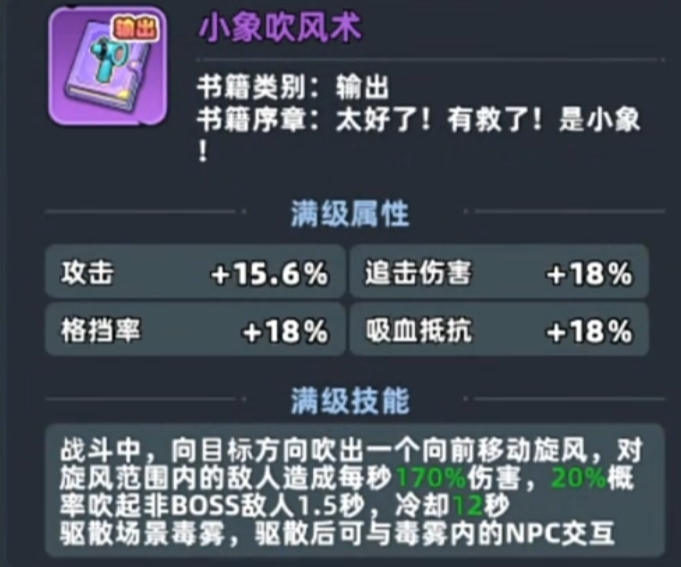 第三种为角色技能驱动方案:装备“小象吹风机”技能书。该技能书为紫色品质,通过技能书卡池抽取获得,抽取概率约为0.8%(单抽);装备后任意角色均可在毒雾边缘激活,释放扇形气流,一次性清除前方5×3格矩形区域毒雾,冷却时间22秒。推荐搭配高移速角色使用,实现快速穿雾探图。