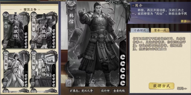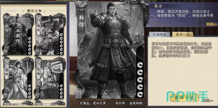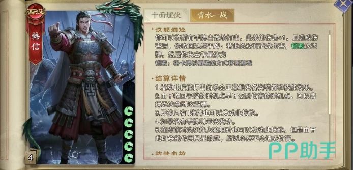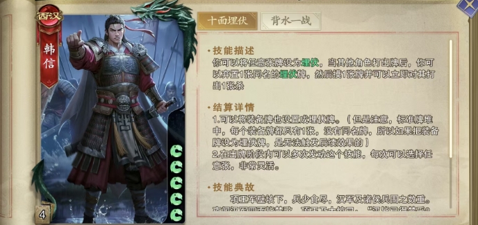 韩信的初始体力设定为5点,但他的真正的效果,还是在于技能上面,首先为大家介绍的是第一个十面埋伏,这一技能允许韩信将任意数量的手牌设置为埋伏状态,当其他角色打出某张牌时,韩信可以选择弃置一张与之同名的埋伏牌,进而摸取一张新牌,并立即对目标角色打出一张杀,这种机制让韩信能够有更多的出手机会以及在杀的效果上面也有一定的提升。