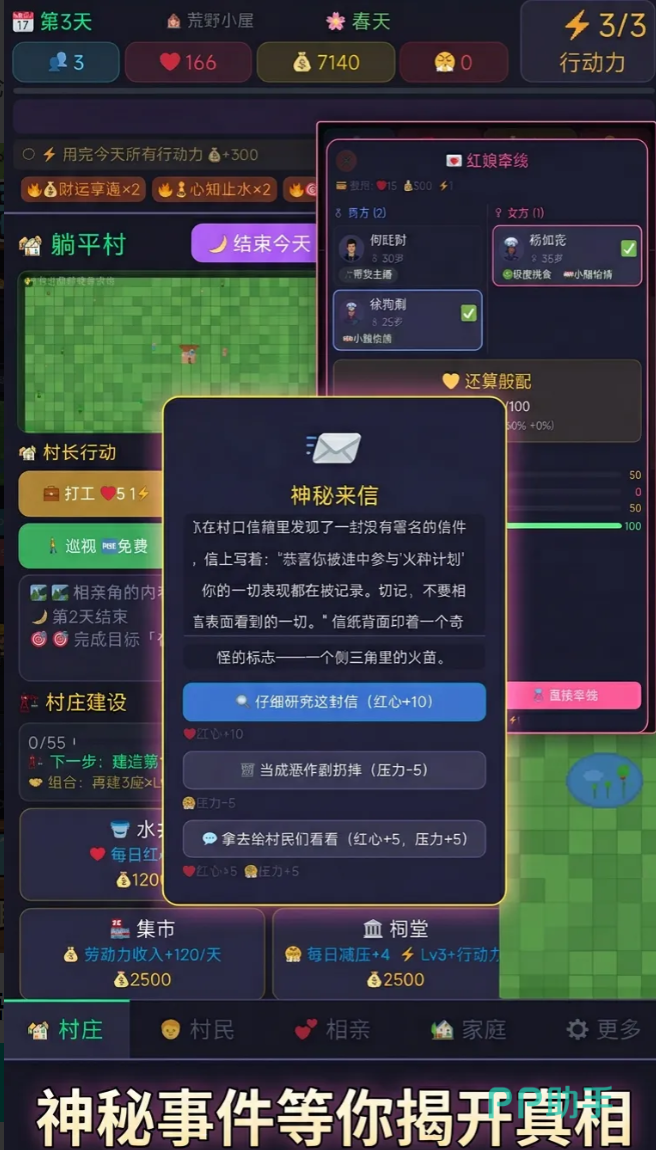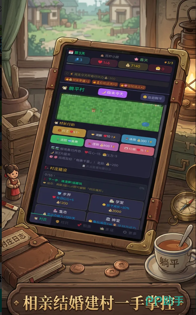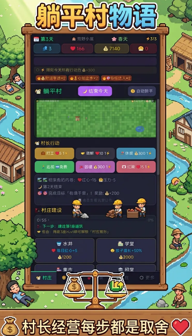 核心玩法围绕“有限行动力”展开:每位玩家每日仅拥有3点行动力。这一设定彻底打破传统模拟经营中资源无限采集的惯性逻辑。你必须在打工赚取金币、委托红娘促成姻缘、调解村民纠纷、或选择休息恢复压力值之间做出取舍——每一次点击,都是对现实优先级的隐喻式复刻。