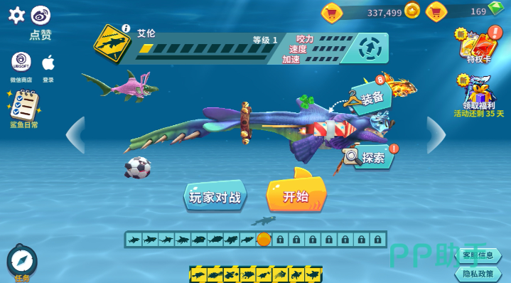 随着游戏的进行,需要解锁和升级更多的鲨鱼种类。这些鲨鱼们的能力与属性都有很大的区别,甚至升级上限都不一样。更好的鲨鱼有着更快的速度、更强的攻击力或特殊的能力。像是黑锤头鲨在前期是刷金必选,而爆吉拉则是后期刷金的首选。合理安排金币和宝石,优先升级那些对我们的需求最有帮助的鲨鱼。而且游戏中还有各种装备和幼鲨可供解锁,这些配件可以提供额外的能力和加成,帮助您在海洋中更好地生存。