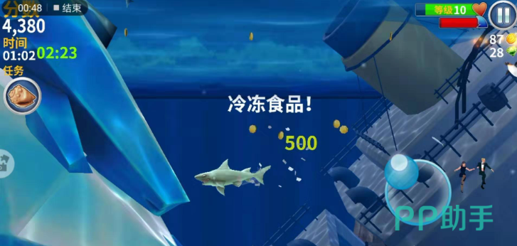 在游戏中还会遇到各种任务和挑战,完成这些可以获得额外的奖励。最常见的就是通过在特定时间内捕食一定数量的猎物或达到一定的分数,可以解锁新的区域和特殊事件。这些挑战不仅增加了游戏的趣味性,也是提升您鲨鱼能力的好机会。这里小编分享一个刷钱小技巧,前期解锁第二条鲨鱼时,不要立刻使用它。用初始鲨鱼前往冰海,一路向右游。如果遇到冰鲨,吃掉它,然后继续游向最右边。会发现两群企鹅,吃掉其中一群,再返回吃另一群。这样无限循环,十分钟内大约能获得1万金币!如果需要还可以调整时间来无限次重复这个方法。