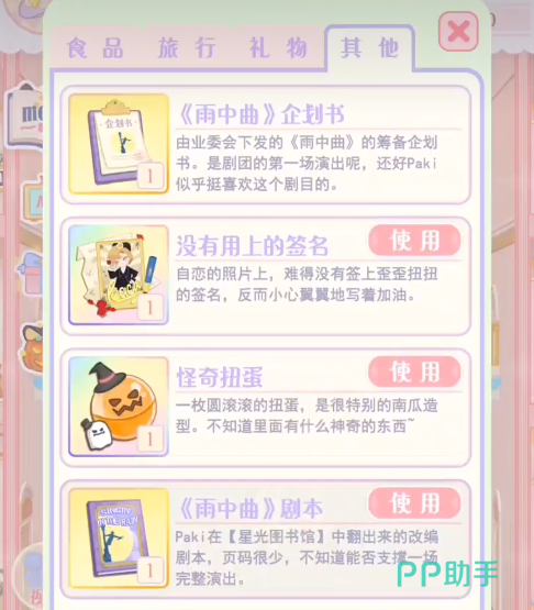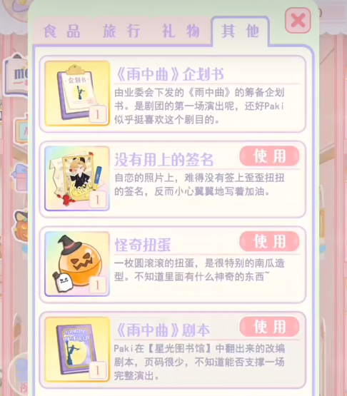 每天玩家还需要在公共的橱柜里放置一些物品,角色在每次出门的时候都会自行选择物品拿取使用,如果角色一旦出行,每次回来都会带回手账,家具或者是剧本,玩家可以帮助对方整理照片,只要帮对方策划剧本应对演出。