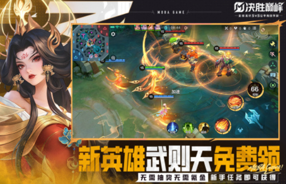 决胜巅峰是根据人气日漫改编过来的,里面会还原几个经典的角色,同时还会设定像武则天这样,大家比较熟知的人物英雄,大家需要和其他4名好友组建队伍,然后在游戏里不断去攻击对方的水晶塔,直至进攻到对方的大本营中,打掉对方阵营中的水晶之后,就能赢得游戏的胜利,每个英雄都有四种不同的技能,需要在游戏里互相配合,使用这些技能击杀对手。