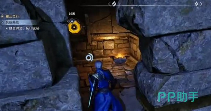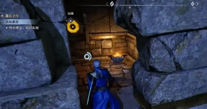 石碑共需三枚碎片:第一枚藏于左侧建筑外壁洞穴内,洞口设有标靶机关,击破后门扉开启;第二枚位于前方封闭铁栅栏后方,需将场景中的蓝色可牵引石块拖至对应压力板上,栅栏方可升起;第三枚置于最高平台显眼处,步行拾取即可。集齐全部碎片后返回青铜石碑,完成安装与拓印操作。待NPC到场检视完毕,再次与其对话确认进度。