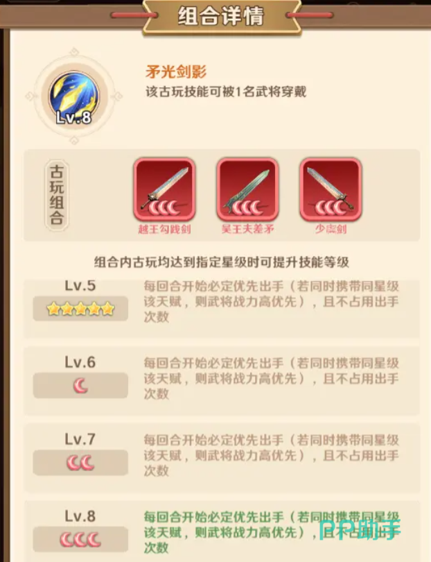 该组合需同时装备越王勾践剑、吴王夫差矛与少虡剑方可激活。生效后,佩戴武将每回合必定获得先手权,且该行动不计入常规出手次数。若敌我双方均携带同星级“矛光剑影”,则以武将战力数值高者优先执行。此机制特别适用于两类角色:一是专注叠加增益、快速积攒怒气的辅助型武将;二是承担关键控制链启动任务的核心输出或控场角色,可稳定抢占节奏,实现战术压制。