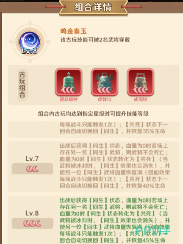 由虢叔旅钟、虎戟镈及成周铃三件古玩共同触发。佩戴后,武将在登场时即获得“同生”状态。当该武将生命值归零时,若场上仍存在另一名处于“同生”状态的友方武将,则立即免于阵亡,并自动将“同生”转化为“共死”效果——此时另一名同生武将的生命值将瞬间恢复至满值。该回血效果整场战斗仅可触发一次。整体而言,该组合构建了双核生存保障体系,尤其适合为队伍中的主力输出与核心辅助进行绑定配置,大幅提升容错率与续航稳定性。