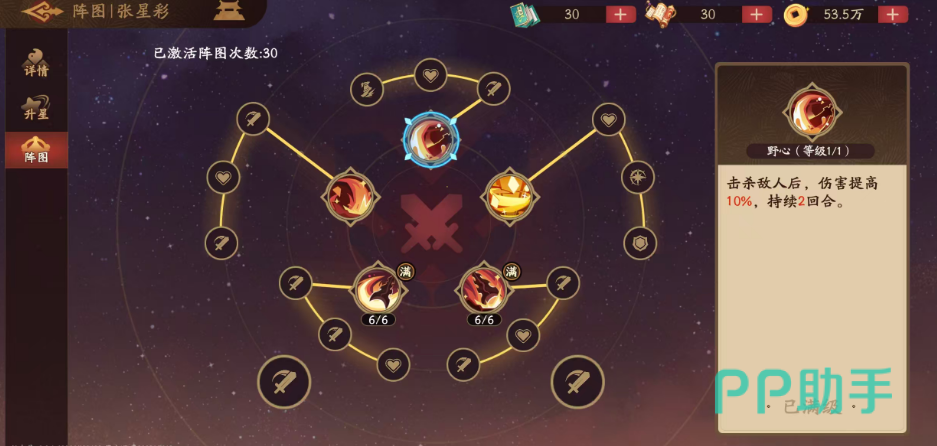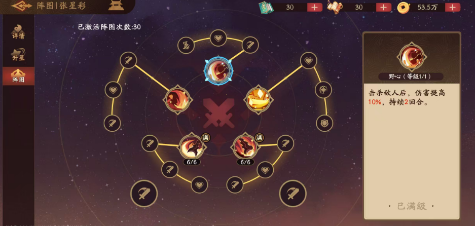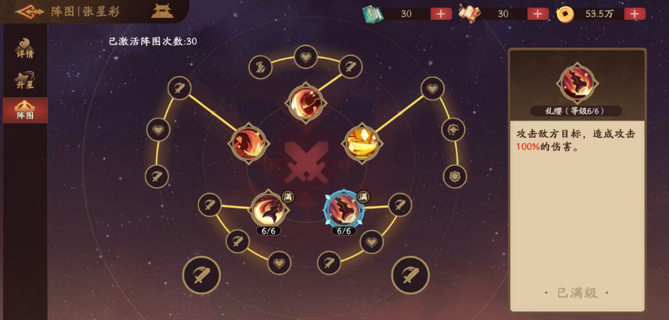 阵图系统为张星彩提供了多维战术延展空间。“乱缨”阵图在6级激活后,可提升全体攻击伤害百分比;“遁藏”则赋予群体伤害减免10%的效果,显著提升她在AOE密集环境下的生存容错率;“野心”机制设定为:成功击杀敌方单位后,立即获得10%伤害加成,并可持续生效两回合;“仇忾”则针对当前生命值高于张星彩的目标,额外提升5%伤害。四大阵图能力彼此互补,构成攻防一体的成长闭环。