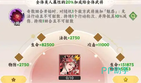 美人系统并非单纯数值堆叠,而是围绕“技能协同”与“属性加成”双轴构建。每位美人拥有独立基础属性及不可替代的专属技能:貂蝉的【魅惑】可使敌方最高战力单位陷入短暂失控状态;大乔的【红袖添香】为我方生命百分比最低的三位武将恢复6%最大生命值,并附加6%减伤效果;孙尚香的【枭鸣箭阵】则对多个目标造成物理伤害,同时降低其10%治疗效果与护盾强度。三者皆能在关键节点打破战场均势,成为扭转胜负的核心变量。