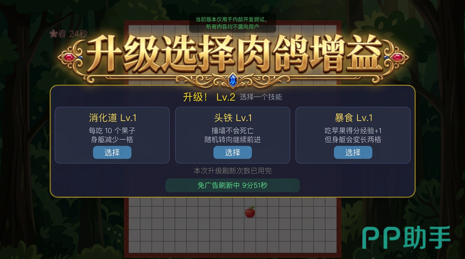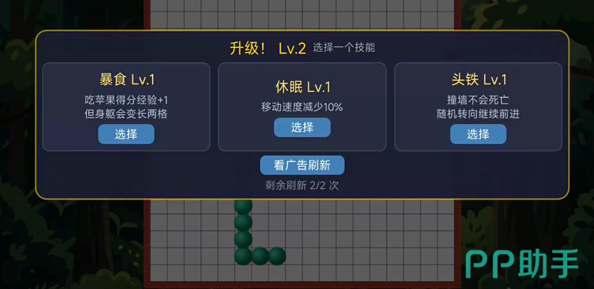 本作的核心亮点在于将Roguelike的随机构筑逻辑深度嵌入贪吃蛇框架中——每局开局技能池不同,升级节点提供多分支抉择,成长路径高度差异化。玩家操控蛇身移动吞食苹果积累经验,升级时需从随机出现的多个技能中择一装配,例如“延长控制”类技能可精准调节体长,在规避碰撞与规划路径中起到关键作用。