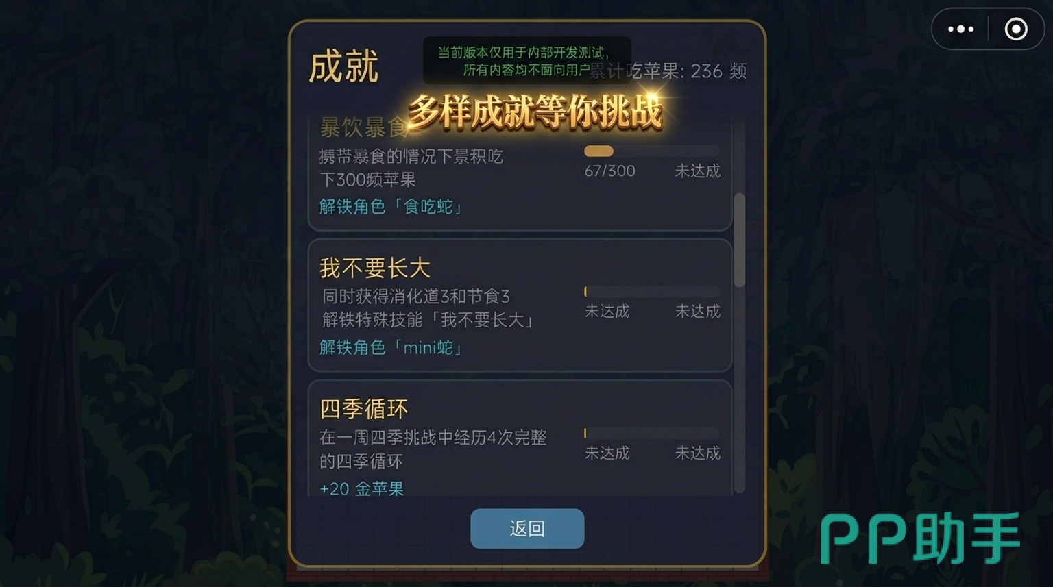 此外,成就系统与角色图鉴构成持续驱动目标。完成特定挑战(如单局存活120秒、累计吞食200个苹果等)可解锁限定外观及专属技能特效。数十种风格迥异的蛇形角色各具视觉辨识度,配合差异化技能组合,使每条蛇在机制与表现层面均呈现独特个性。