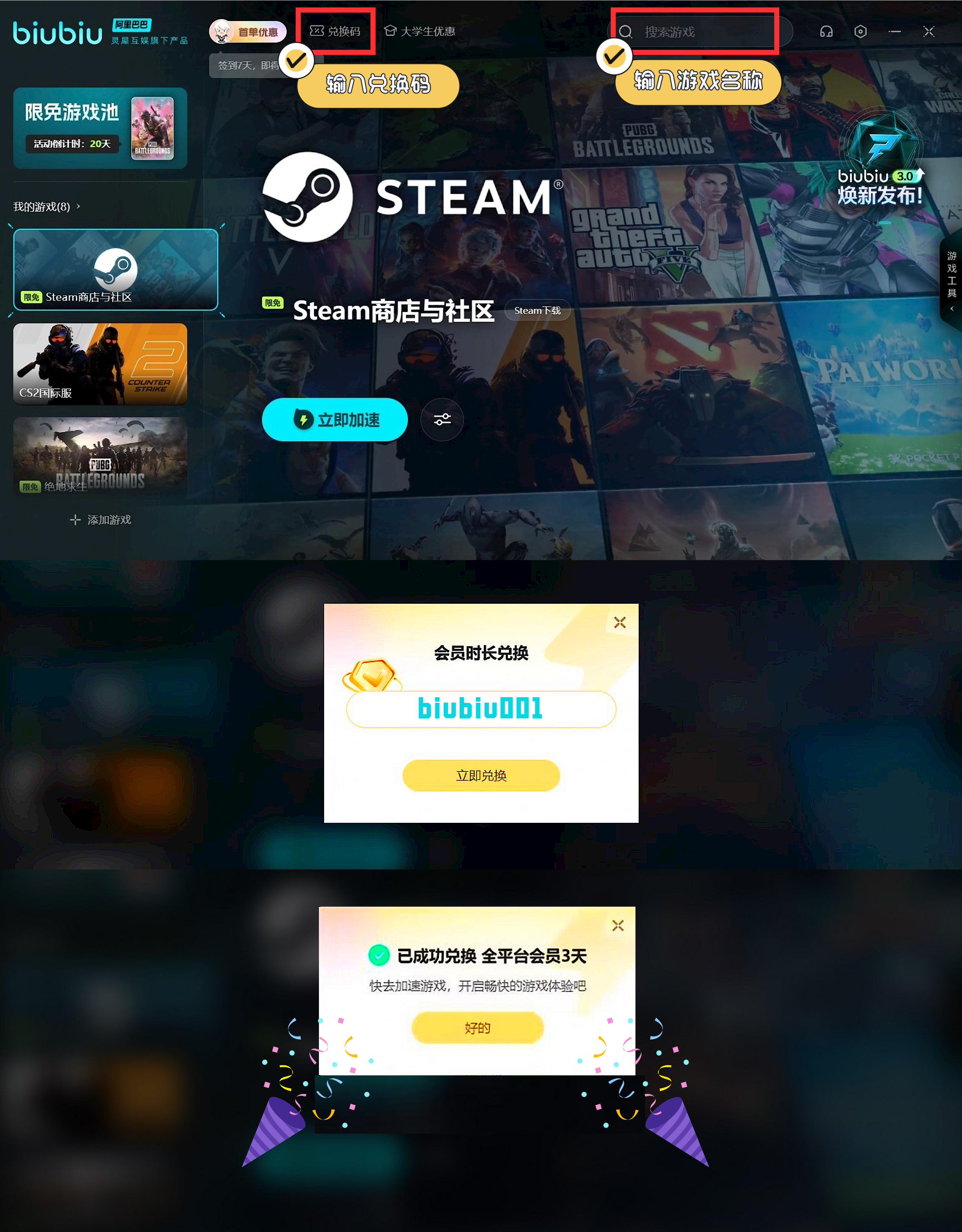 需要注意的就是steam的服务器性能有的时候可能并不顺畅,用户会遇到无法登录的现象,那么不如就用网络优化器去优化网络连接,尽情的参加这次的活动。biubiu加速器现在还有免费加速时长可以领取,所有的用户都可以通过兑换码【biubiu001】获取72小时加速时长,还有一个3小时的新手礼包。如果将这两种方法叠加在一起,新手最高可以免费75小时。