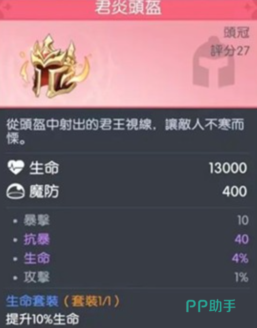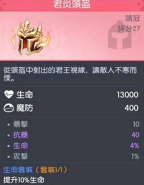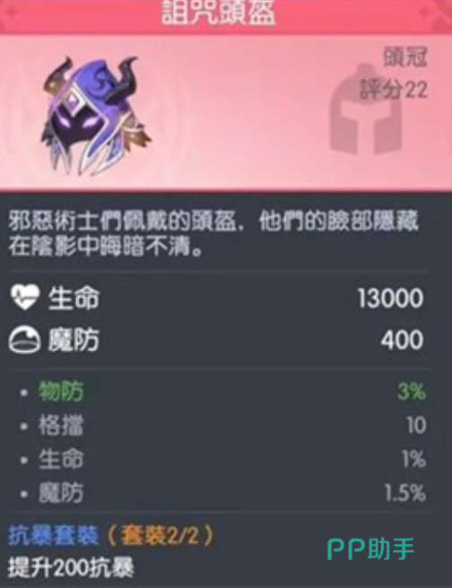 实战中,推荐将“狂暴套装”作为堕落女武神的绝对主力套装。该套装所有部位均提供稳定抗爆率加成,契合角色天赋对暴击抵抗的强依赖性。在装备栏位允许的前提下,应确保头盔、胸甲、护手、腰带、战靴及饰品六部位全部携带含抗爆属性的装备,优先保证整体抗爆率突破65%阈值——这是触发其被动回血与伤害衰减机制的关键临界点。