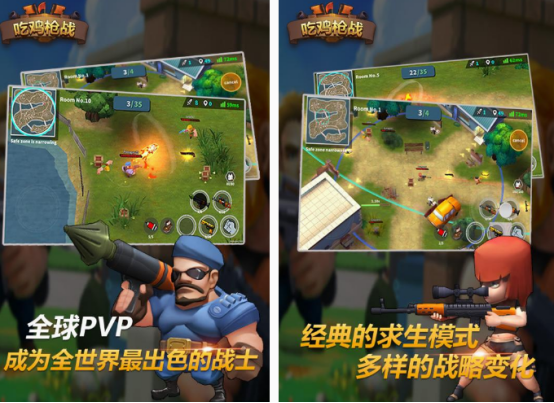 这款采用卡通风格所设置的吃鸡游戏,不仅是休闲类型的射击手游,更是采用3d画面所设置的小游戏,通过你在把握射击时机的方式,来将敌人消灭以后,就能完成闯关获得最终的胜利。虽然游戏的人物比较可爱,但是却能帮助大家享受紧张刺激的氛围,给大家带来很多的乐趣。也是操作方式比较简单的,通过瞄准对手的方式,享受枪枪爆头所带来的爽快射击手感。