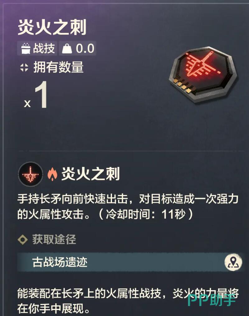 关于炎火之刺的获取方式,玩家需要前往古代战场遗迹区域,在击败区域内刷新的各类怪物后,有一定概率掉落该技能书。建议多次刷怪以提高获取几率。