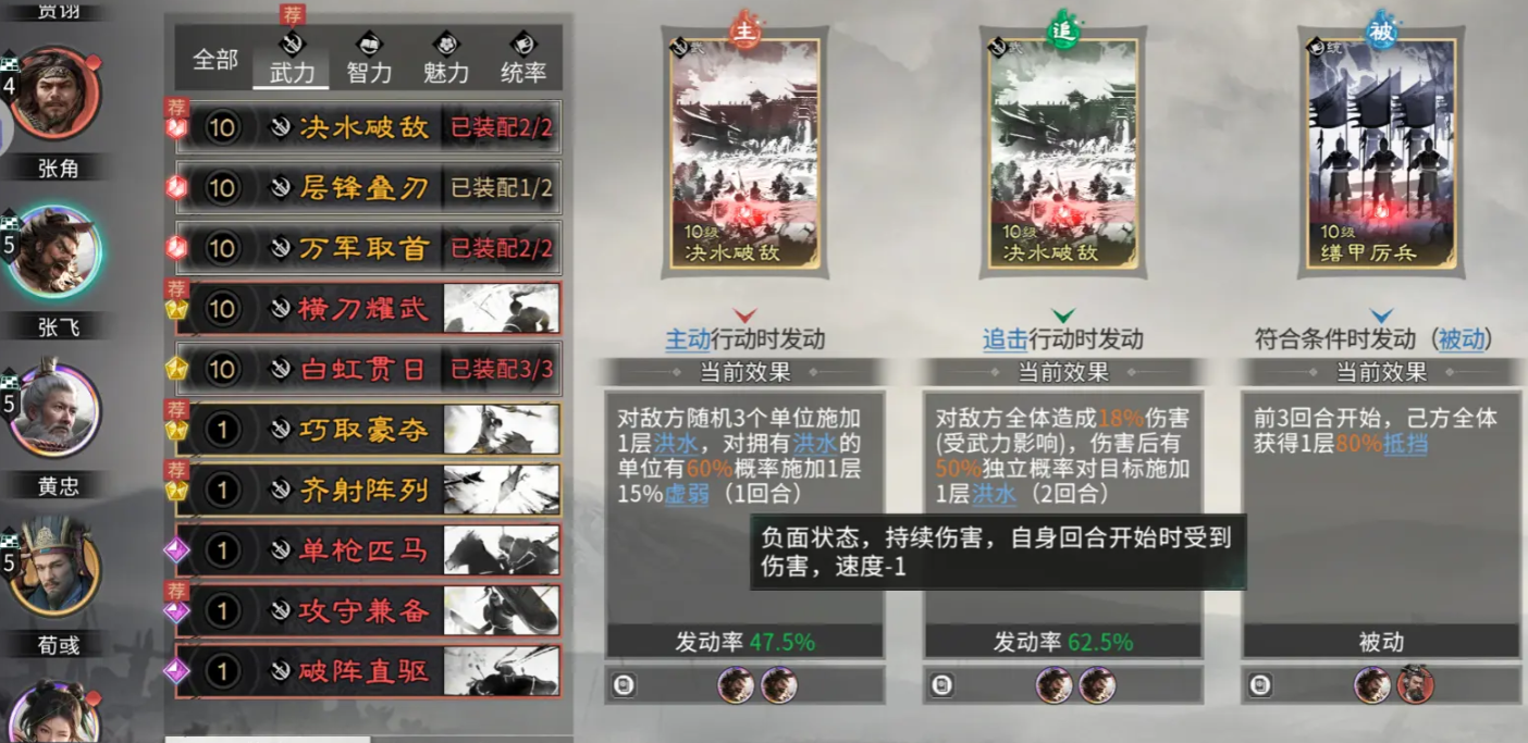 张飞技能优选“决水破敌”与“缮甲厉兵”:前者施加“洪水”状态,随层数累积降低敌方行动速度并延长虚弱持续时间;后者提升自身防御与反击强度,在承受伤害的同时反向压缩敌方回合资源。二者协同可构建稳定控场节奏,为黄忠创造无干扰输出窗口,并通过群体追击扩大伤害覆盖面。