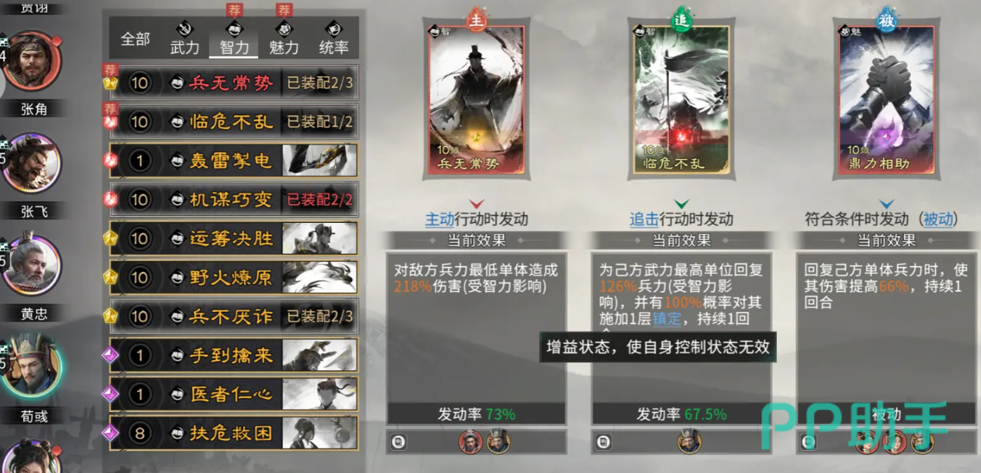 荀彧技能推荐“兵无常势”与“临危不乱”组合:前者在敌方血量低于阈值时触发倍率加成,强化收割能力;后者可在黄忠行动前为其提供定向武力回复与控制免疫,既稳固输出环境,又间接提升团队整体DPS上限。