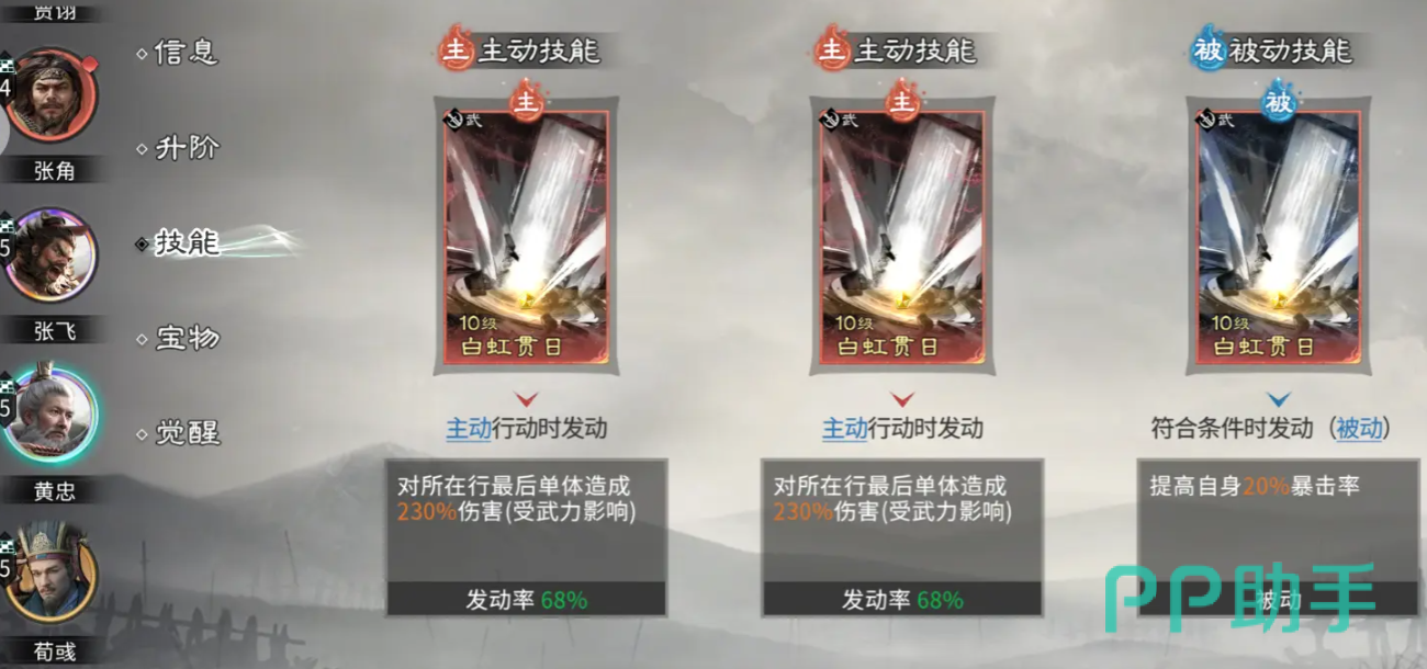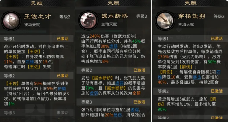 天赋配置方面,荀彧必带“王佐之才”,提供11%全属性攻防双向加成,显著提升队伍四维成长基线;张飞首选“据水断桥”,在造成虚弱状态的同时附加易伤效果,大幅放大后续伤害转化率;黄忠核心天赋锁定“穿杨饮羽”,该效果专精于后排目标锁定与暴击强化,是整套秒杀逻辑的输出支点。