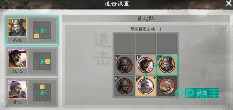 推荐主力阵容为:黄忠(后排右)、张飞(前排左)、荀彧(前排右)。该布阵兼顾控制链、生存保障与爆发节奏。其中,张飞承担前排抗压与先手压制职能,其高额减益覆盖率可有效削弱敌方行动效率;荀彧则以前排辅助身份提供持续增益与状态维持,确保黄忠全程处于高输出环境。关键站位细节在于:“双穿杨军”效果必须与黄忠同处后排,并严格确保黄忠行动时能触发荀彧所铺设的追击格子,以此激活连动伤害机制。