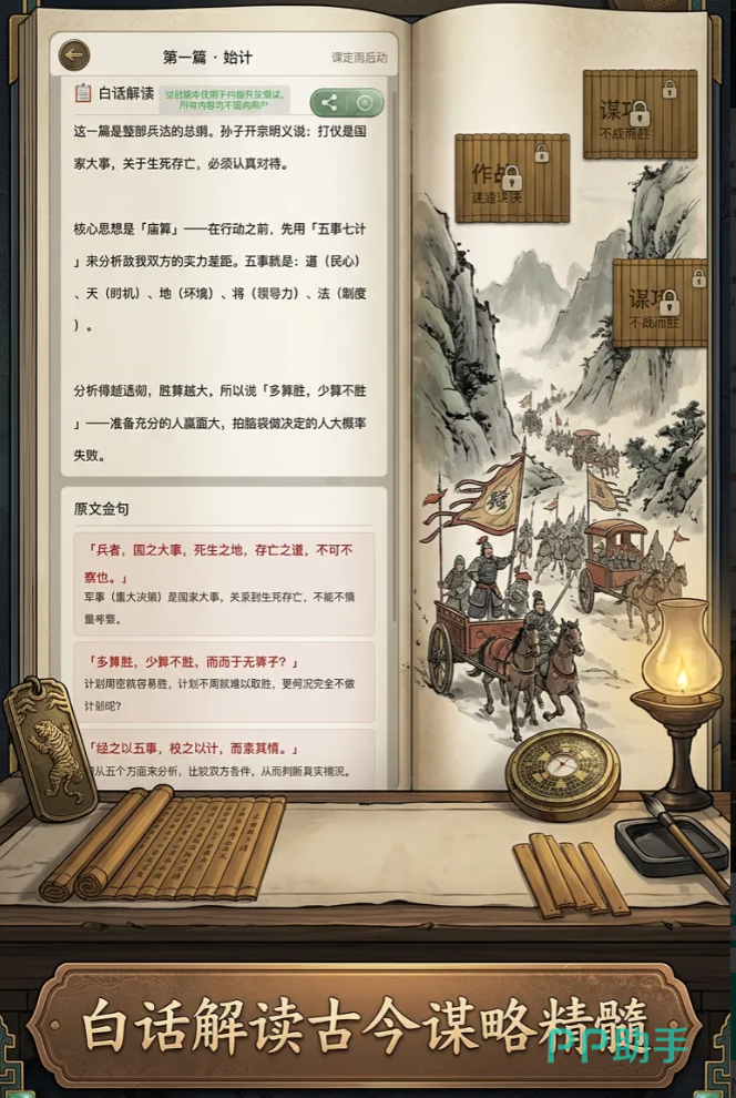 区别于传统回合制战棋或卡牌对战模式,本作首次将“谋略即操作”的理念落地为可交互的实时决策体验。玩家化身统帅,在还原历史语境的沙盘中调度兵马、权衡利害——是效法“兵贵神速”突袭敌后,还是践行“不战而屈人之兵”的顶层博弈?每一次指令输入,都直指兵法核心逻辑的具象化演绎。