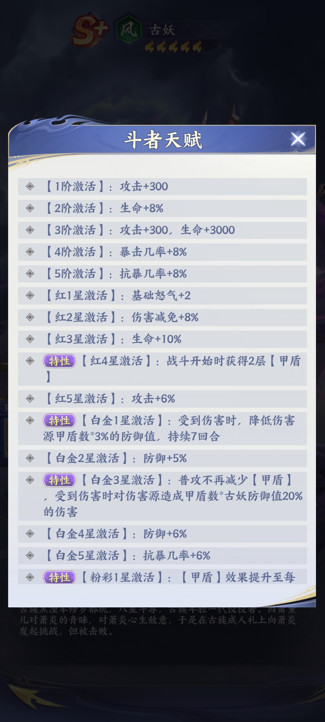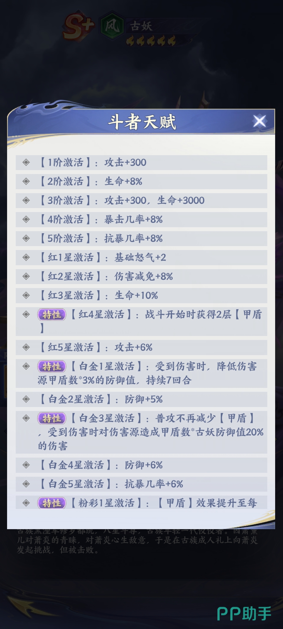 值得注意的是,古妖的成长曲线呈明显后期倾斜:低星阶段仅具备常规前排功能,而高星解锁后,甲盾上限、减伤比例及大招倍率将获得质变提升。其强度高度依赖星级突破与天赋树深度开发,建议玩家在资源允许前提下,优先完成关键星级节点(如5星、7星)以激活核心被动效果。