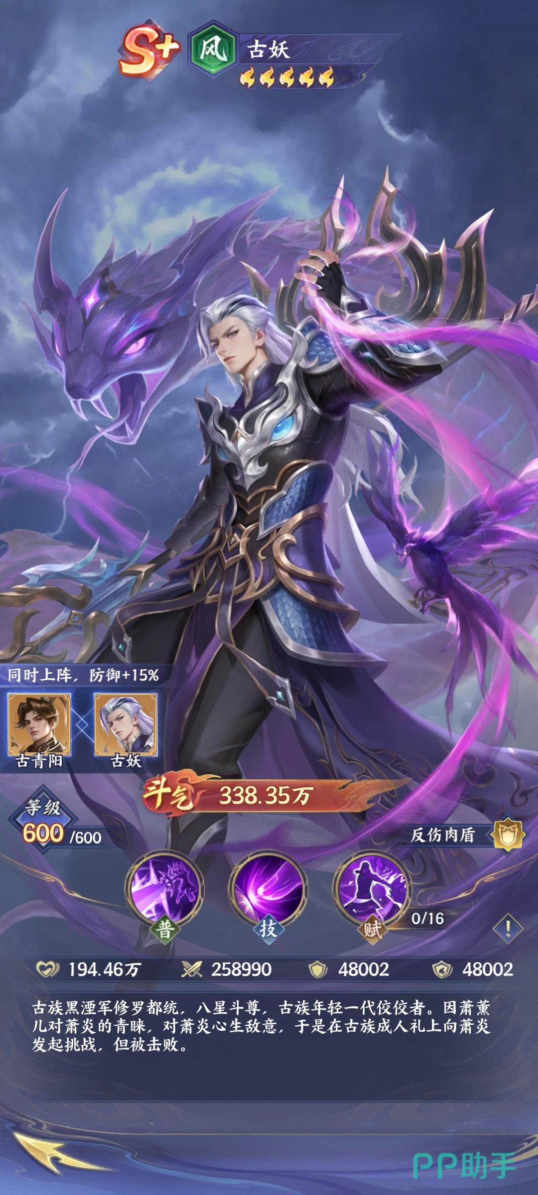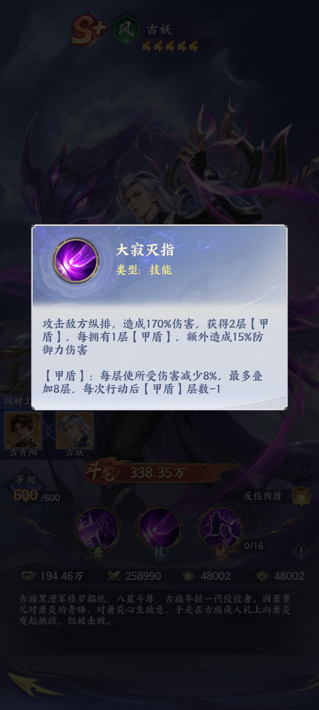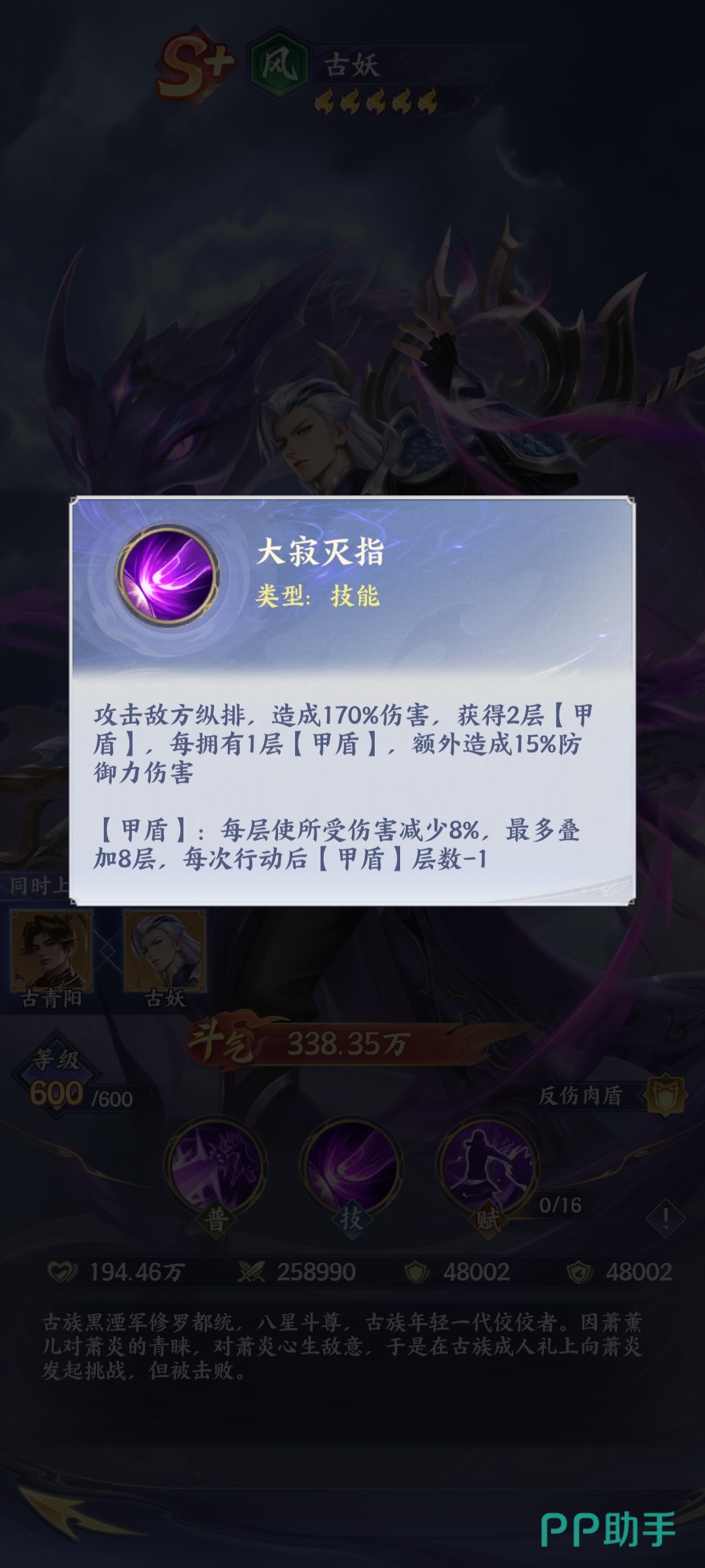 《斗破苍穹》手游中古妖是否值得投入资源培养?作为S+级护盾型英雄,古妖的核心机制围绕“甲盾”展开——该机制不仅提供减伤与反伤双重生存保障,更在叠层后显著强化输出能力。其技能“大寂灭指”可在甲盾存在期间触发高额伤害,实现坦辅兼备的战术价值。