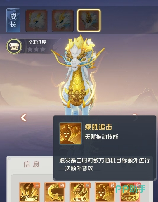 龙马的核心优势集中于两大被动:其一为“同仇敌忾”,该效果在龙马出手瞬间触发——我方每拥有一只存活灵兽,即有10%独立概率为其叠加“等级×2”的物理攻击加成。若多只队友同时成功触发,加成可叠加,单次攻击物攻增幅可达数十点甚至更高,从而打出远超面板预期的爆发伤害,令对手难以预判实际输出上限。其二为“乘胜追击”,当龙马普攻或技能命中并触发暴击时,将立即对敌方随机一名目标发动一次额外普攻。该效果无冷却限制,仅依赖暴击率,实测在暴击率≥40%时,平均每1.5–2次攻击即可稳定触发一次,高频追击显著提升清场效率与残局收割能力。