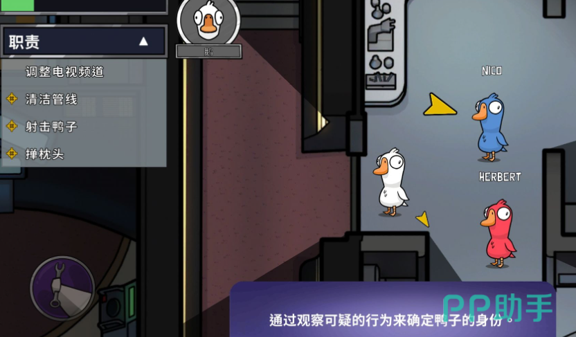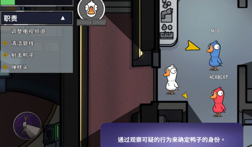 游戏非常考验玩家们的策略和推理能力,小伙伴们在游戏中将会被分为三个阵营,分别是好人方大鹅,坏人方鸭子和中立方鸟。在开始游戏之后,好人阵营的玩家们需要在地图上不断地探索,并且完成系统派发给你的任务,而坏人阵营的玩家则需要追踪你在地图上遇到的好人,并且攻击他们。好人阵营的玩家们被击杀之后会在地上留下尸体,而在讨论环节,大家就需要根据各自的线索讨论谁才是真正的凶手,并且将他票出去。
