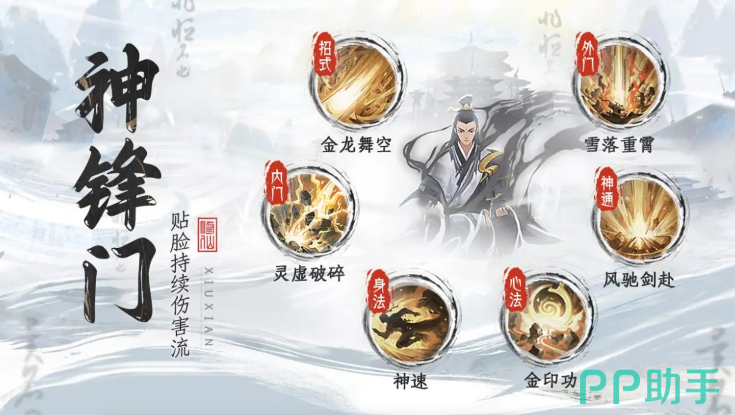 神锋门以“金”为本源属性,走极致近战爆发路线,所有主力输出技能均需贴身触发。其技能体系强调位移压缩、洞察叠加与瞬时引爆三重节奏:外门功法【雪落重霄】可化身剑影突袭目标,附带基础伤害与“洞察”状态;内门功法【灵虚破阵】具备一段强制位移,是起手接敌的核心手段;身法【神速】提供无前摇闪现,大幅提升切入效率;群攻招式【金龙舞空】召唤金龙盘旋周身,对范围内所有近距单位持续施加伤害并叠加洞察;神通【风驰剑赴】为终结技,消耗当前全部洞察层数,按层数比例结算高额真实伤害;心法【金印功】则作为控制补强,在配合【雪落重霄】命中时可触发眩晕效果,显著提升生存容错。