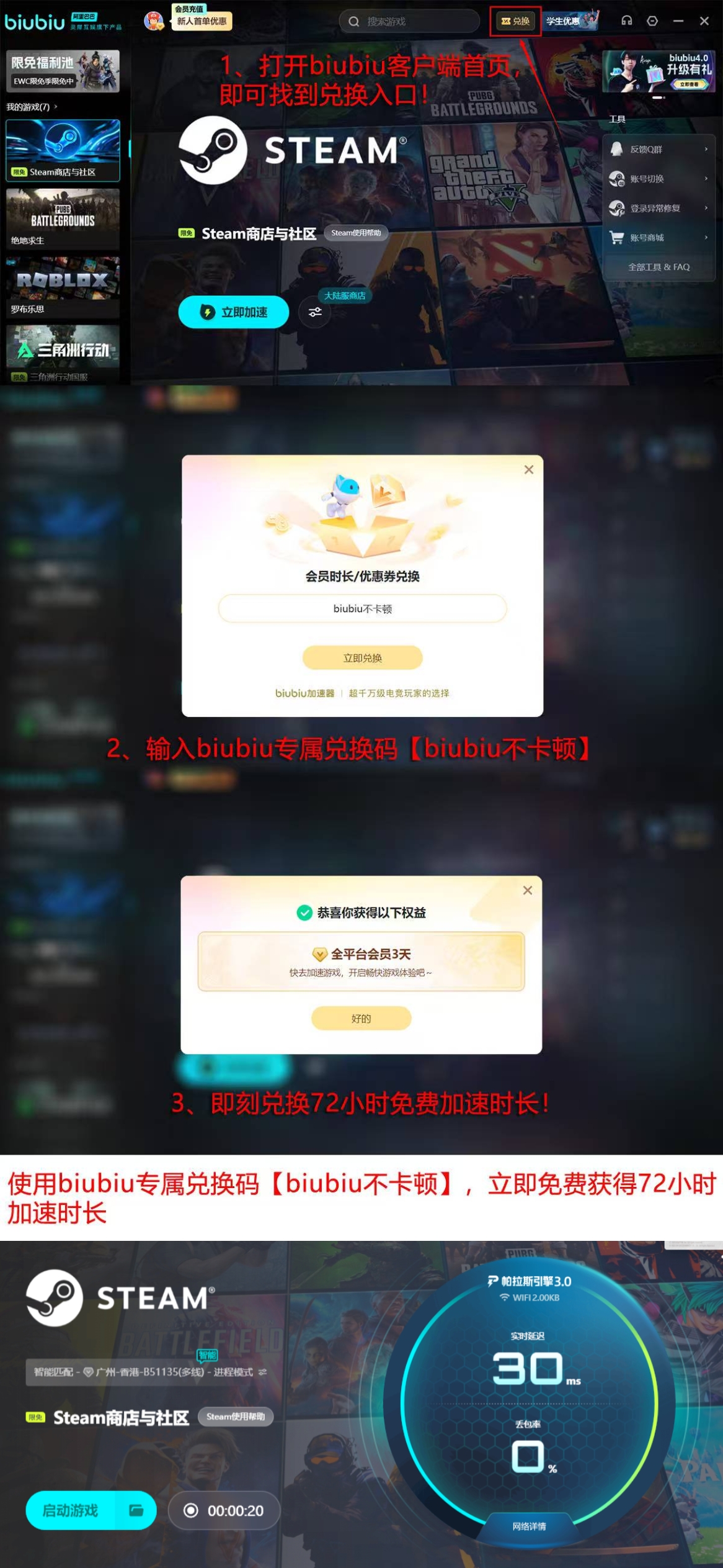新用户完成注册后,输入激活口令【biubiu不卡顿】即可解锁高级会员权限,有效期为72小时;叠加首登自动发放的24小时试用期,总计可享96小时无限制加速服务。该权益覆盖全部服务器节点与游戏模式,适用于高频探索型及联机协作型玩家群体。
