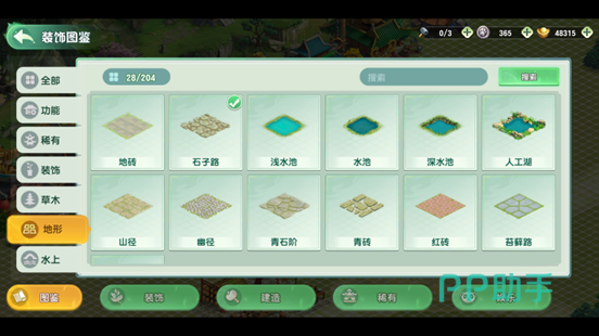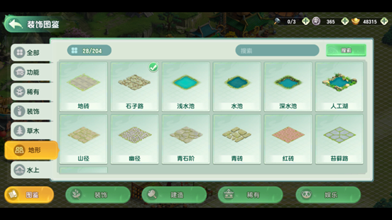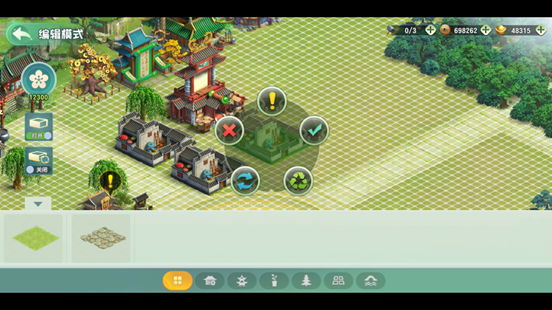 除建筑布置外,系统支持地形编辑功能:可铺设石子路、开凿水域、架设桥梁等。所有改造后的地形均支持建筑摆放,实现真正意义上的立体化建设。
