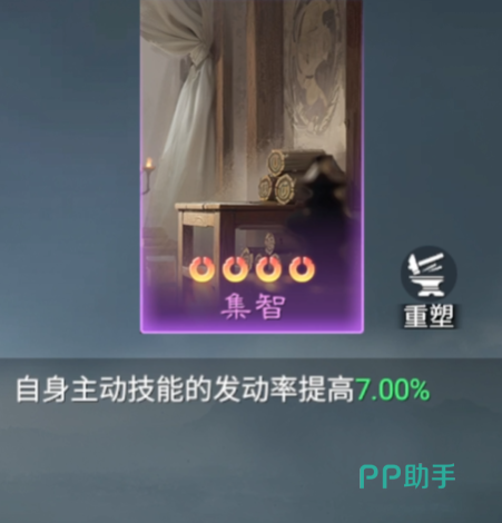第三张值得重点考虑的是“集智”技能卡,其作用在于提升主动技能的附加效果触发概率。每次成功释放主动技能时,额外效果的触发几率提升7%。虽然增幅看似有限,但对于原本技能触发率较高的武将而言,此增益可显著放大输出或控制优势。