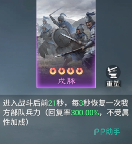 最后介绍“戌脉”技能卡,其具备强力的战斗中回血能力。在战斗进行至第21秒后触发,之后每3秒为我方武将恢复相当于兵力数值300%的生命值。值得注意的是,该恢复效果不受其他属性加成影响,属于固定高效治疗手段,适合用于持久战阵容构建。