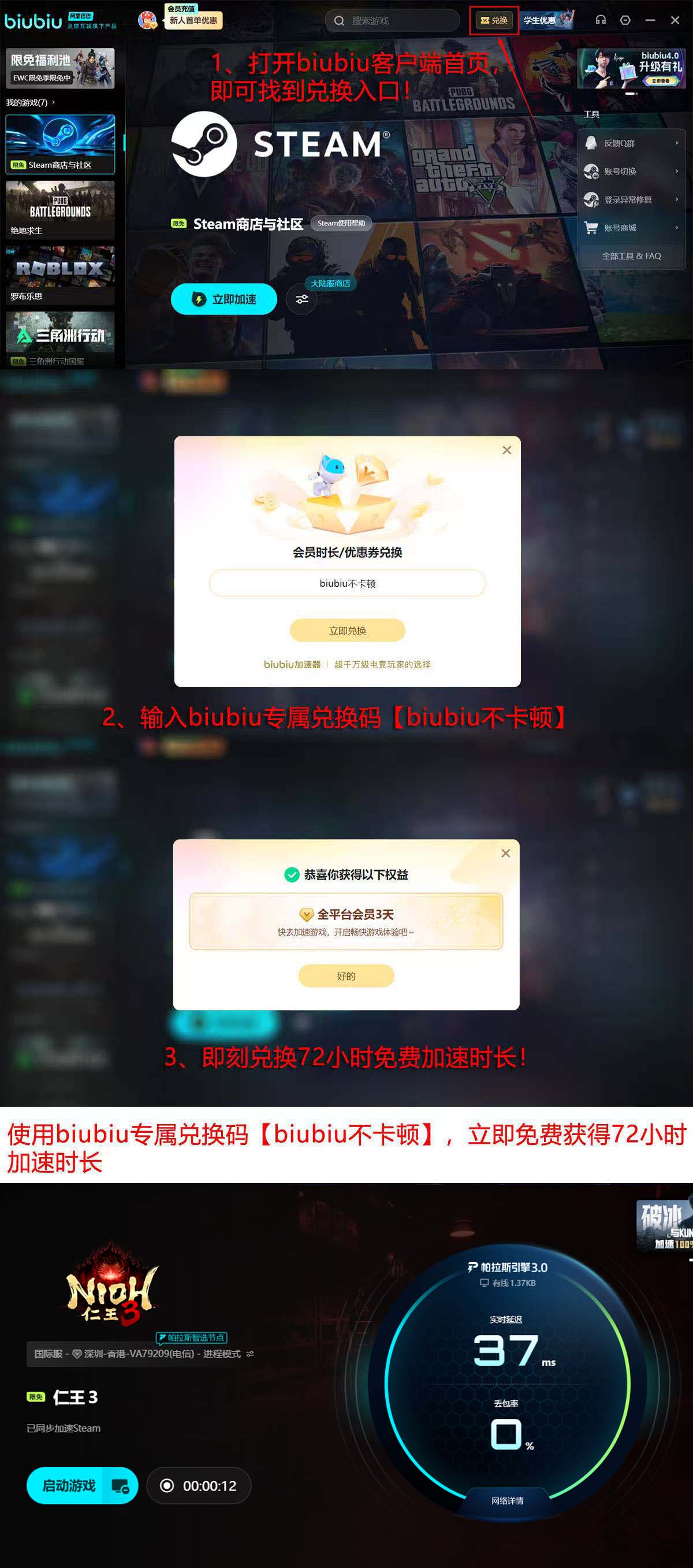 针对新用户,biubiu加速器开放限时免费体验权益:完成账号注册即可获赠24小时新手时长;进入首页“兑换”页面,输入口令【biubiu不卡顿】,还可额外领取72小时加速时长,总计可享96小时无门槛使用权限。