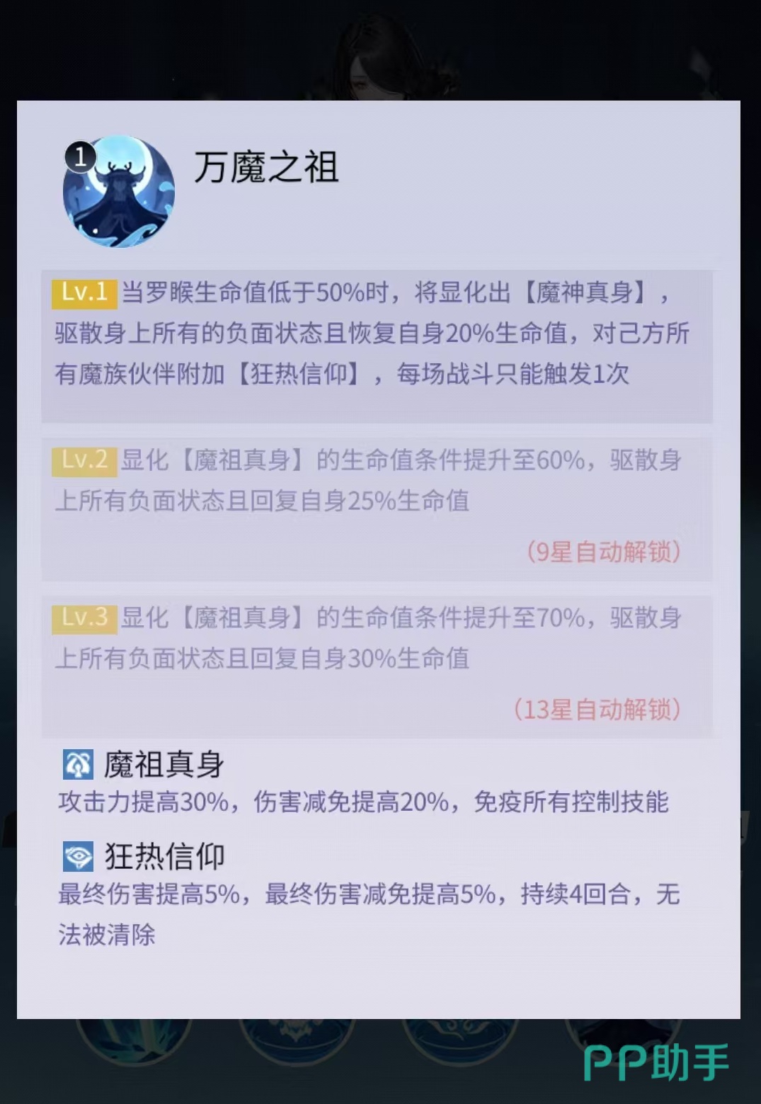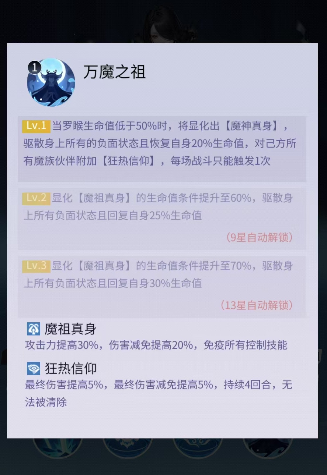 大招为半血触发机制:当罗睺生命值降至50%以下时,立即变身为魔神真身,清除自身全部负面状态,并恢复一定比例生命值;同时为所有魔族队友赋予“狂热信仰”增益,提升其最终伤害。这一设计使其兼具生存韧性与团队增幅能力,避免传统前排角色易暴毙的短板。