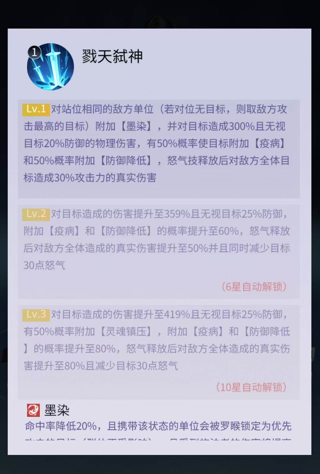 罗睺的核心机制围绕“墨染”状态构建。其一技能可对同排敌方单位施加墨染效果,造成高额物理伤害并无视部分防御值;命中后有概率附加疫病(持续掉血)与防御降低两重减益。墨染状态不仅削弱目标命中率,更会强制罗睺在后续行动中优先锁定该目标。当怒气值满时释放怒气技,可对敌方全体造成一次真实伤害,规避所有防御类减免,实现稳定输出穿透。
