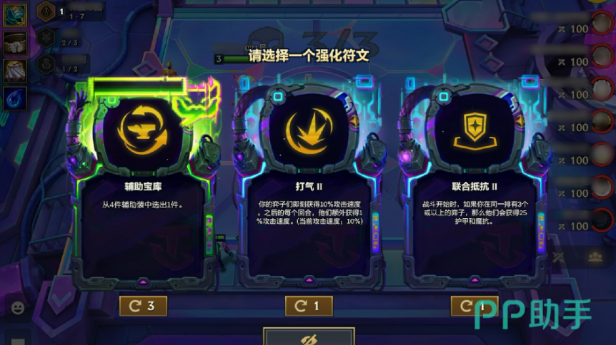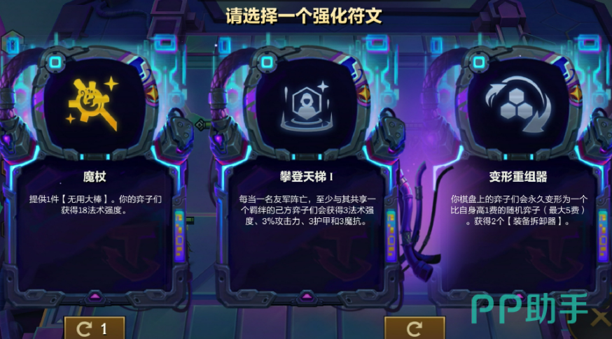 强化符文的黑客攻击是赛博城市中的一大亮点。黑客通过改变强化符文的选择和数量,为弈士们提供了前所未有的选择自由。你可能会在最初的强化符文格里,看到一些看似熟悉的符文,但随着回合的推进,这些符文的种类会逐渐丰富,甚至出现一些随机的变化。这种重随机制让你的强化符文选择不再单调,可以根据局势灵活应对,充分调动你的策略潜力。