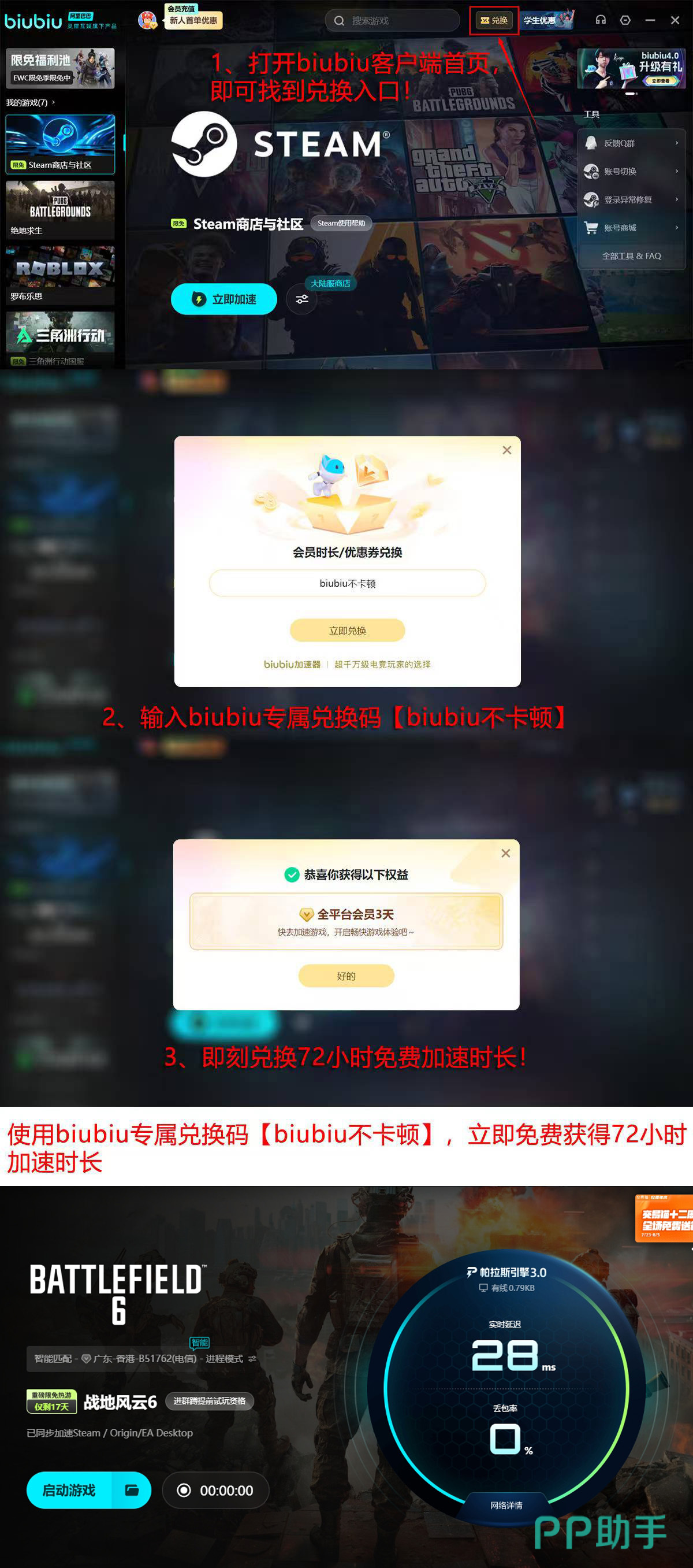 为进一步提升用户体验,biubiu特别邀请职业电竞选手左梓轩担任产品体验官,基于实战反馈对客户端进行了深度调优,目前用户可通过官方活动获取免费试用时长,例如输入【biubiu不卡顿】兑换码,可在应用内领取72小时加速权限,新注册用户还将额外获赠24小时体验时间,总计可达96小时。