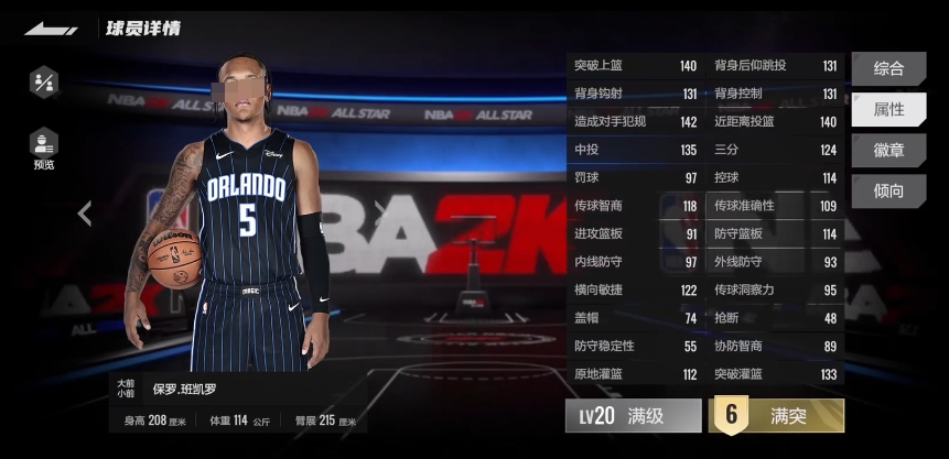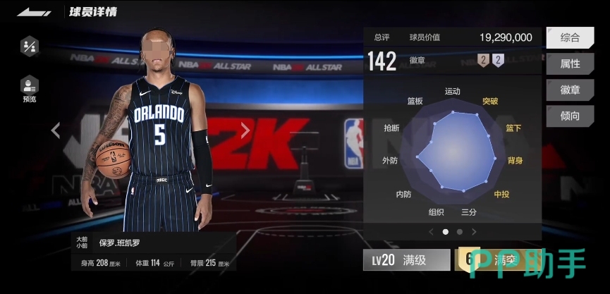 此外114的控球能力也是他自身的一个短板,在面对一些控球技术出色的对手时,可能会出现失误的情况,不过值得一提的是,他拥有122的速度,这对于一个大模型的球员来说,无疑是一项优势,他可以利用自己的速度在快攻中迅速推进,或者在防守轮转中及时到位,弥补一些其他方面的不足,在徽章方面班凯罗目前所拥有的徽章数量并不多,只有两铜两银。