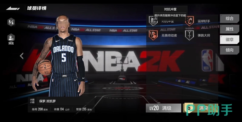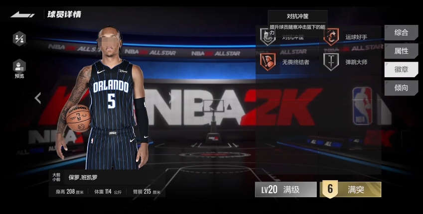 其中包括铜品质的运球好手和无畏终结者,以及银品质的对抗冲框和弹跳大师,虽然徽章数量不多,但这四枚徽章与他自身的模型以及属性贴合得非常好,运球好手徽章能够让他在运球过程中更加流畅,减少被对手抢断的风险,无畏终结者徽章则进一步提升了他在篮下的终结能力,对抗冲框徽章增强了他在内线对抗中的冲击力弹跳大师徽章则充分发挥了他出色的弹跳能力,使他在抢篮板和封盖等方面更具优势。